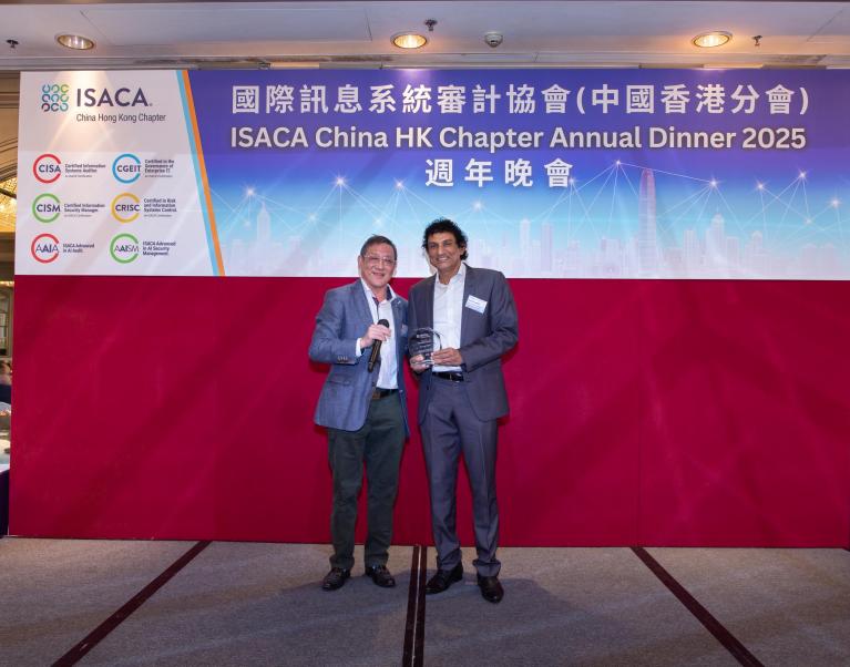 Prof. Percy Dias receives Commitment and Dedicated-Service Award from the China Hong Kong Chapter of ISACA, a global professional association and learning organization with 185,000 members in digital trust fields such as information security, governance, assurance, risk, privacy and quality.